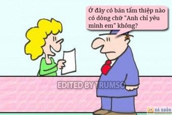 - Ở đây có bán tấm thiệp nào có dòng chữ /Anh chỉ yêu mình em/ không?